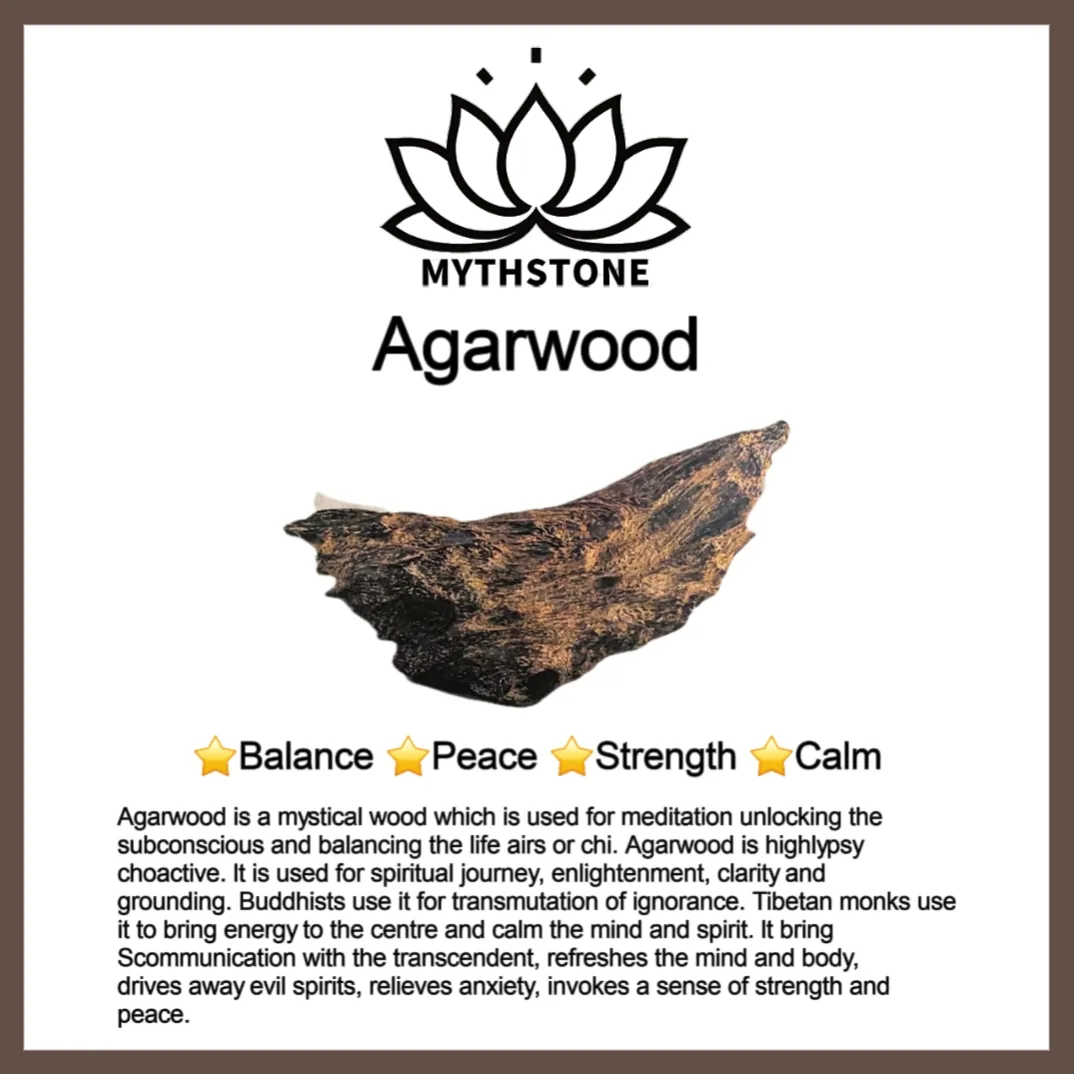 Agarwood is a mystical wood that is used for meditation unlocking the subconscious and balancing the life airs or chi. Agarwood is highly psychoactive. It is used for spiritual journey. enlightenment. clarity. and grounding. Buddhists use it for the transmutation of ignorance. Tibetan monks use it to bring energy to the center and calm the mind and spirit. It brings communication with the transcendent. refreshes the mind and body. drives away evil spirits. relieves anxiety. and invokes a sense of strength and peace.