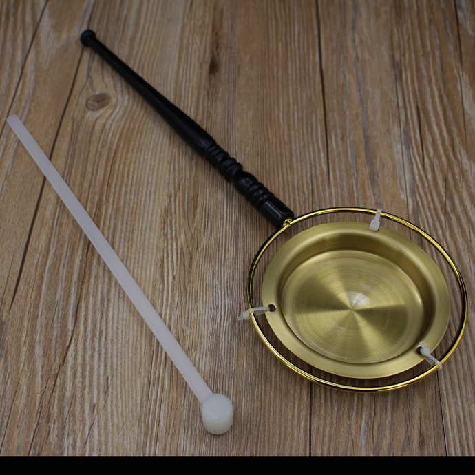 Traditional one hand cymbal “Dang” made of copper with a handle made of wood. The hammer is made of plastic.