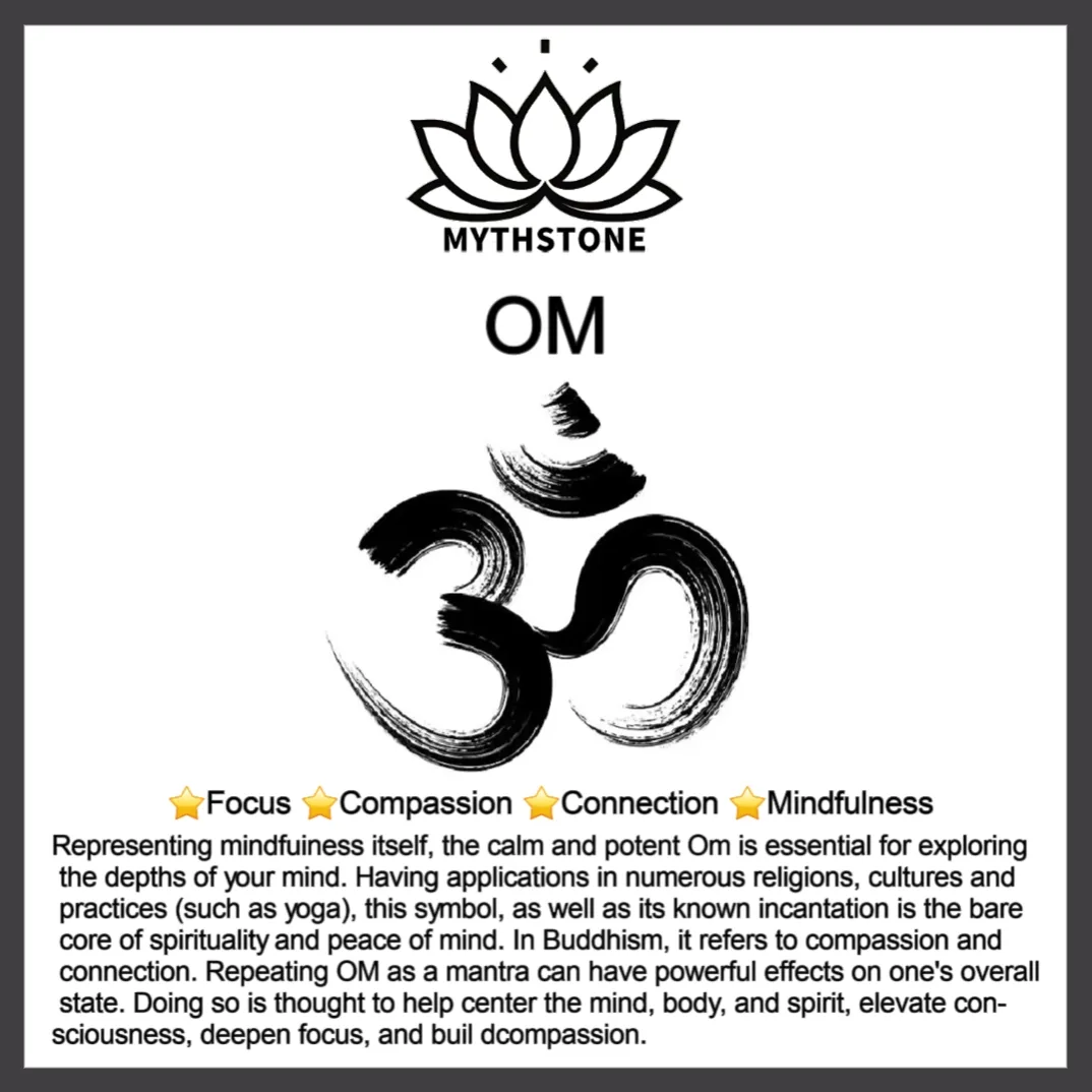 Representing mindfulness itself. the calm and potent Om is essential for exploring the depths of your mind. Having applications in numerous religions. cultures and practices (such as yoga). this symbol. as well as its known incantation is the bare core of spirituality and peace of mind. In Buddhism. it refers to compassion and connection. Repeating Om as a mantra can have powerful effects on one’s overall state. Doing so is thought to help center the mind. body. and spirit. elevate consciousness. deepen focus. and build compassion.
