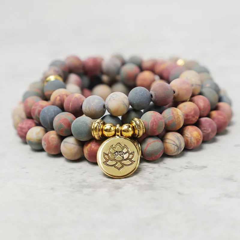 MythStone – 108 Mala Beads Courage Energy Bracelet with Picasso Jasper