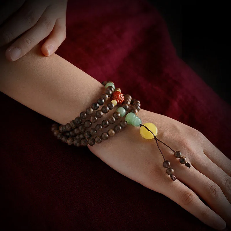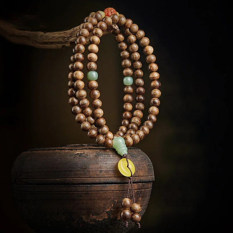 MythStone 108 Mala Beads Kalimantan Agarwood Gourd Jade Amber Balance Bracelet