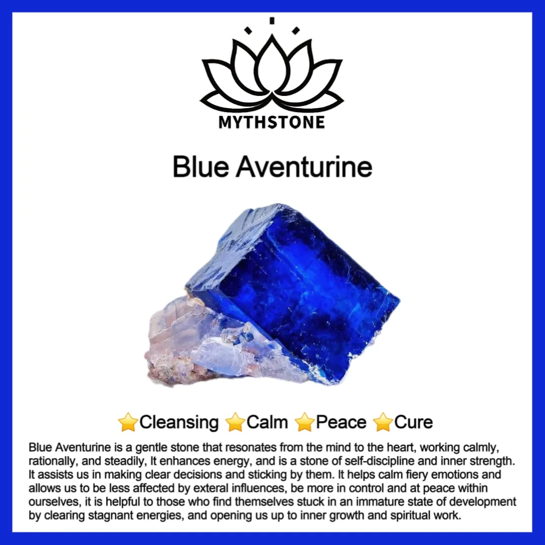 Blue Aventurine is a gentle stone that resonates from the mind to the heart. working calmly. rationally. and steadily. It enhances energy and is a stone of self-discipline and inner strength. It assists us in making clear decisions and sticking by them. It helps calm fiery emotions and allows us to be less affected by external influences. be more in control. and at peace within ourselves. It is helpful to those who find themselves stuck in an immature state of development by clearing stagnant energies and opening us up to inner growth and spiritual work.