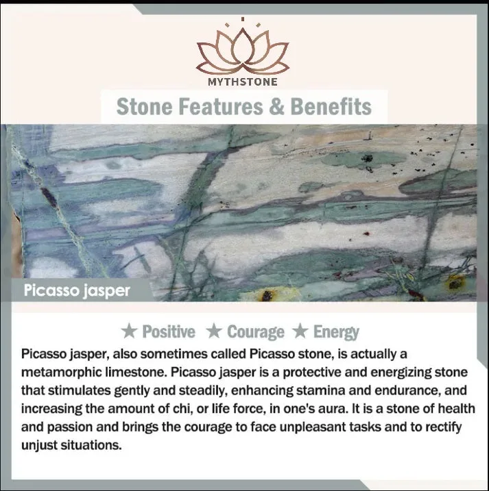 Picasso jasper. also sometimes called Picasso stone. is actually a metamorphic limestone. Picasso jasper is a protective and energizing stone that stimulates gently and steadily. enhancing stamina and endurance. and increasing the amount of chi. or life force. in one’s aura. It is a stone of health and passion and brings the courage to face unpleasant tasks and rectify unjust situations.