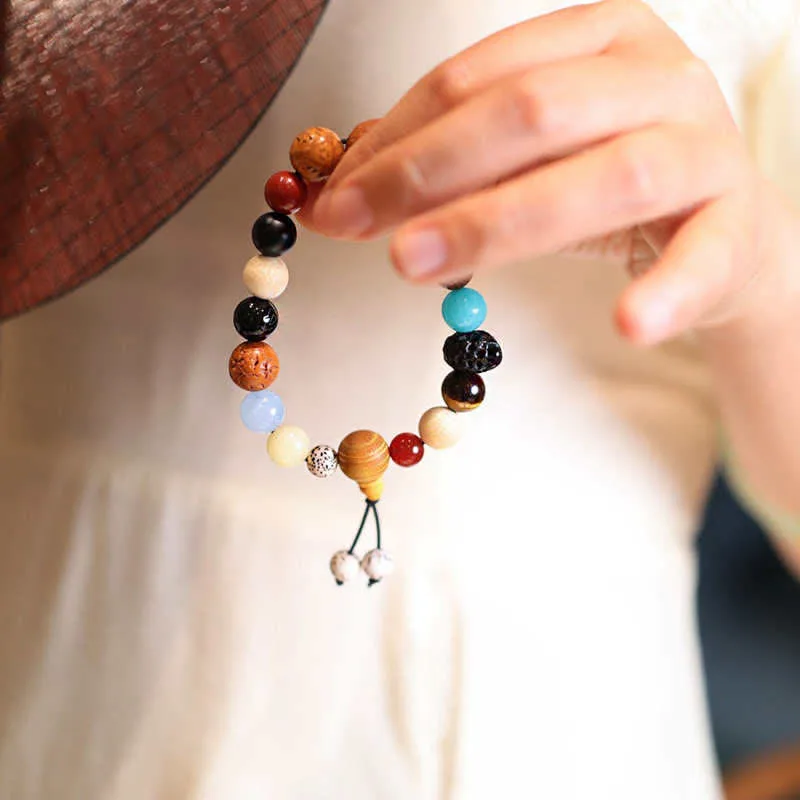 • Material: Bodhi Seed. Red Stone. Agate. Frosted Stone. Golden Silk Bamboo Beads. Sardonyx. Rudraksha Bodhi Seed. Random Bead. Jade. Red Agate. Tiger Eye. Blue Chalcedony. Picasso Jasper