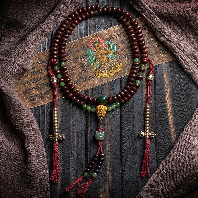 Tibet 108 Mala Beads Bodhi Seed Hetian Cyan Jade bracelet combines tradition with spiritual significance. The 108 mala beads aid in meditation. while the purple bodhi seeds and Hetian cyan jade promote wisdom and tranquility. The copper dorje symbolizes protection. making this bracelet a meaningful accessory for enhancing peace and spiritual growth.