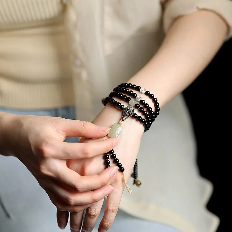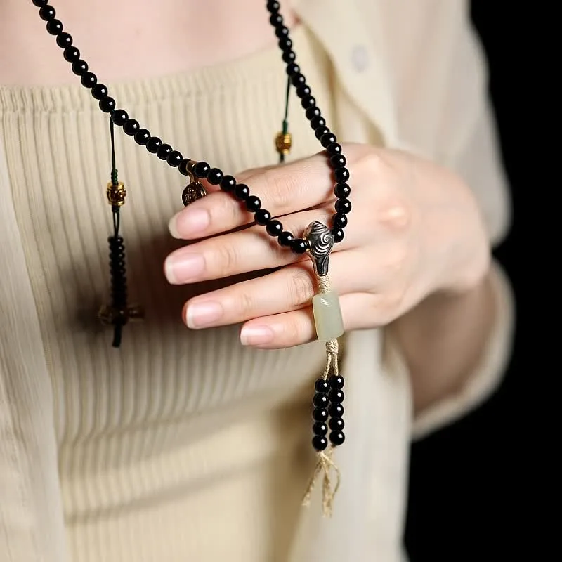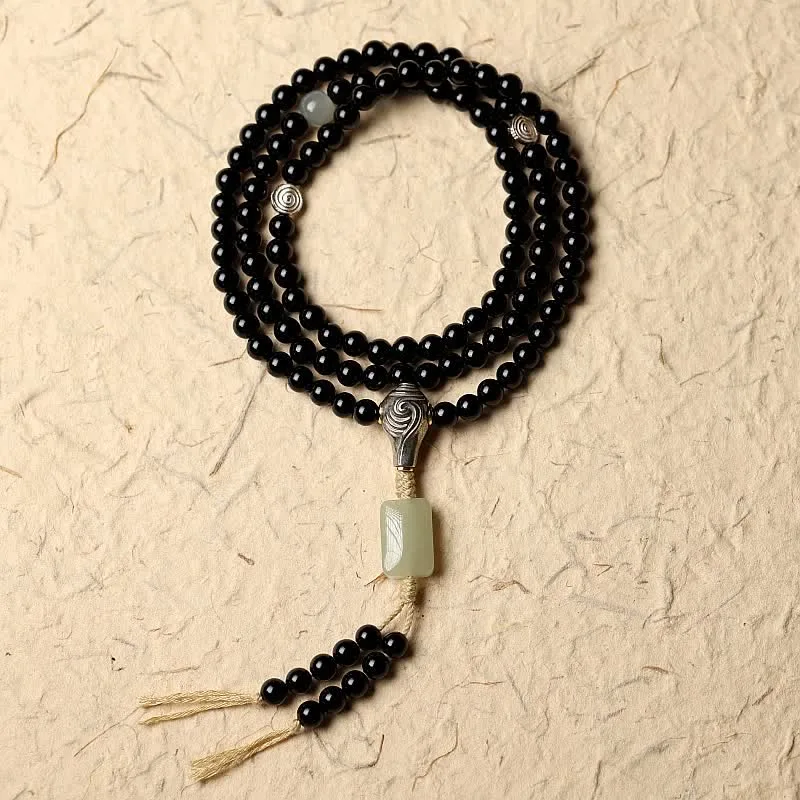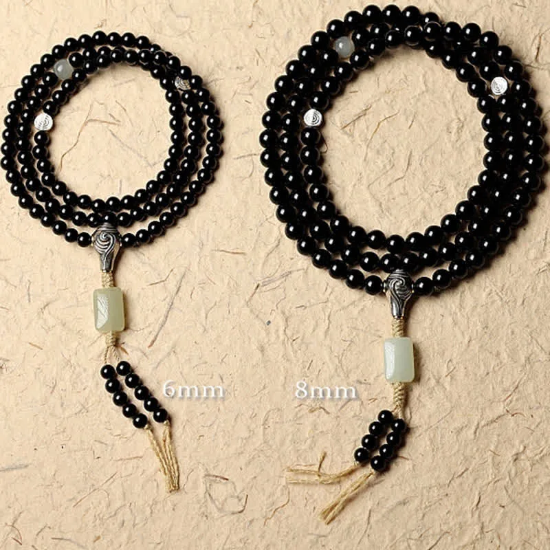 MythStone Tibetan Black Onyx Hetian Jade 108 Mala Beads Fortune Bracelet