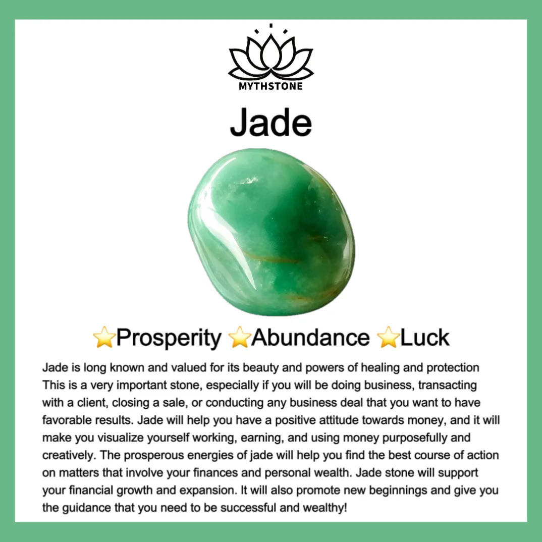 Jade is long known and valued for its beauty and powers of healing and protection. This is a very important stone. especially if you will be doing business. transacting with a client. closing a sale. or conducting any business deal that you want to have favorable results. Jade will help you have a positive attitude towards money. and it will make you visualize yourself working. earning. and using money purposefully and creatively. The prosperous energies of Jade will help you find the best course of action on matters that involve your finances and personal wealth. Jade stone will support your financial growth and expansion. It will also promote new beginnings and give you the guidance that you need to be successful and wealthy!