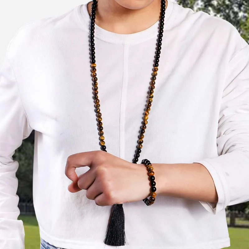 This beautiful MythStone Tiger Eye & Black Onyx Protection Necklace Mala Set is thoughtfully handcrafted with premium. natural materials. Created to offer empowerment and protection. it enhances your strength. focus. and willpower. enabling you to face life’s challenges and pursue your aspirations with confidence. The set incorporates Tiger Eye. a powerful stone known for helping you remain grounded and balanced. especially during life’s toughest times.